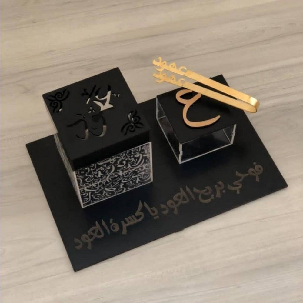 تحتوي مبخرة الحرف العربي على صندوق بخور، صينية تحمل الاسم المطلوب، مبخرة بحجم كبير.
